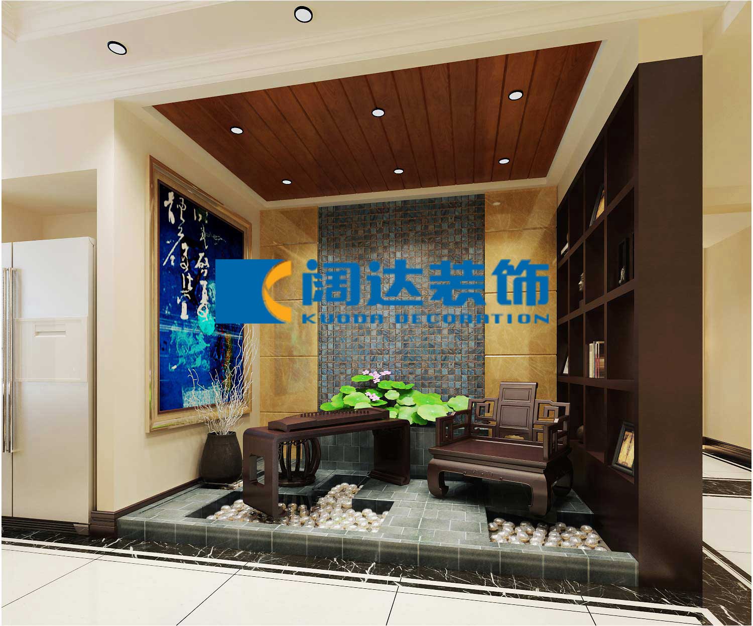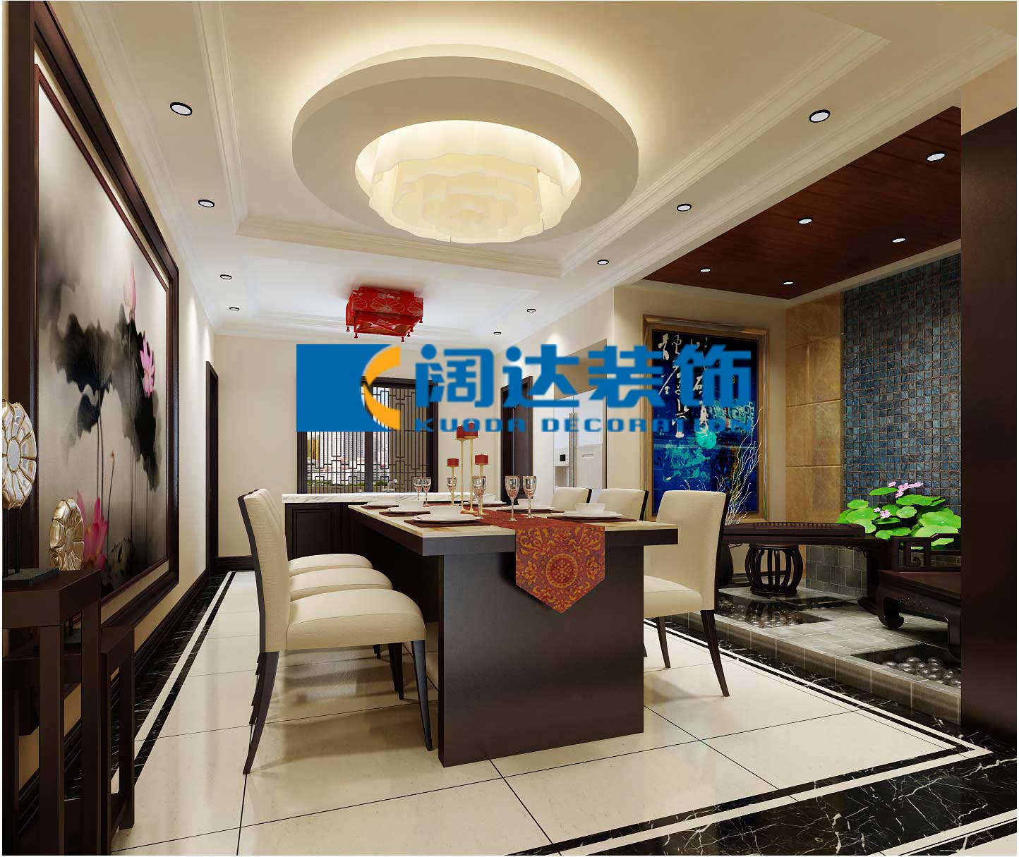 使生活的實用性和對傳統文化的追求同時得到了滿足。背景墻的造型簡潔現代,這種絕妙的組合給人以強烈的視覺意志力,成為時尚與古典的柔媚結合。