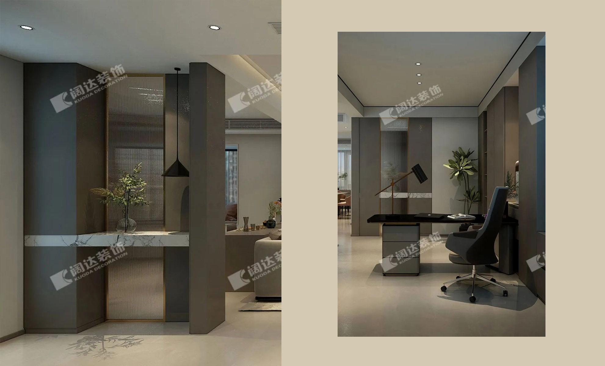 在整個空間中,不論是客廳、書房還是臥室都用了木色格柵鋪墊;一門到頂的柜體、木門等看似簡潔的造型和搭配,延展出優雅的調性,讓居住者輕易感受到生活的真趣。