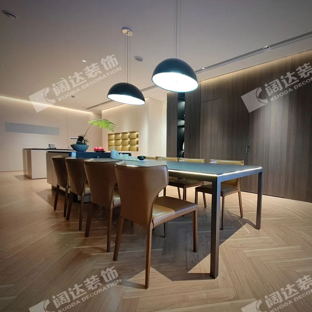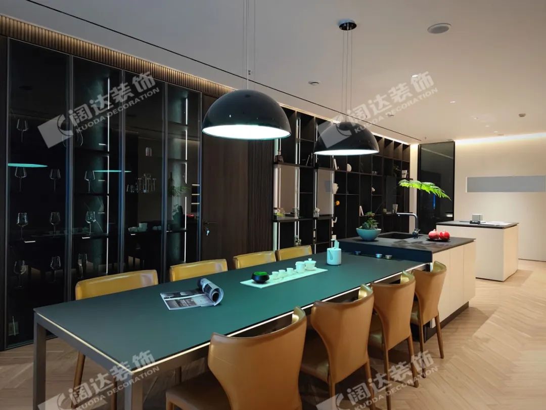 社交洽談區域采用當代最流行的膚感飾面制作一體化島臺桌面,既提升品質,又有觸碰島臺桌面時的舒適感,在餐桌的前后分別有大面積的玻璃酒柜和可封閉式西廚操作臺,桌面邊上采用軌道插座,實用的設計,滿足了用餐和辦公的雙重需求。