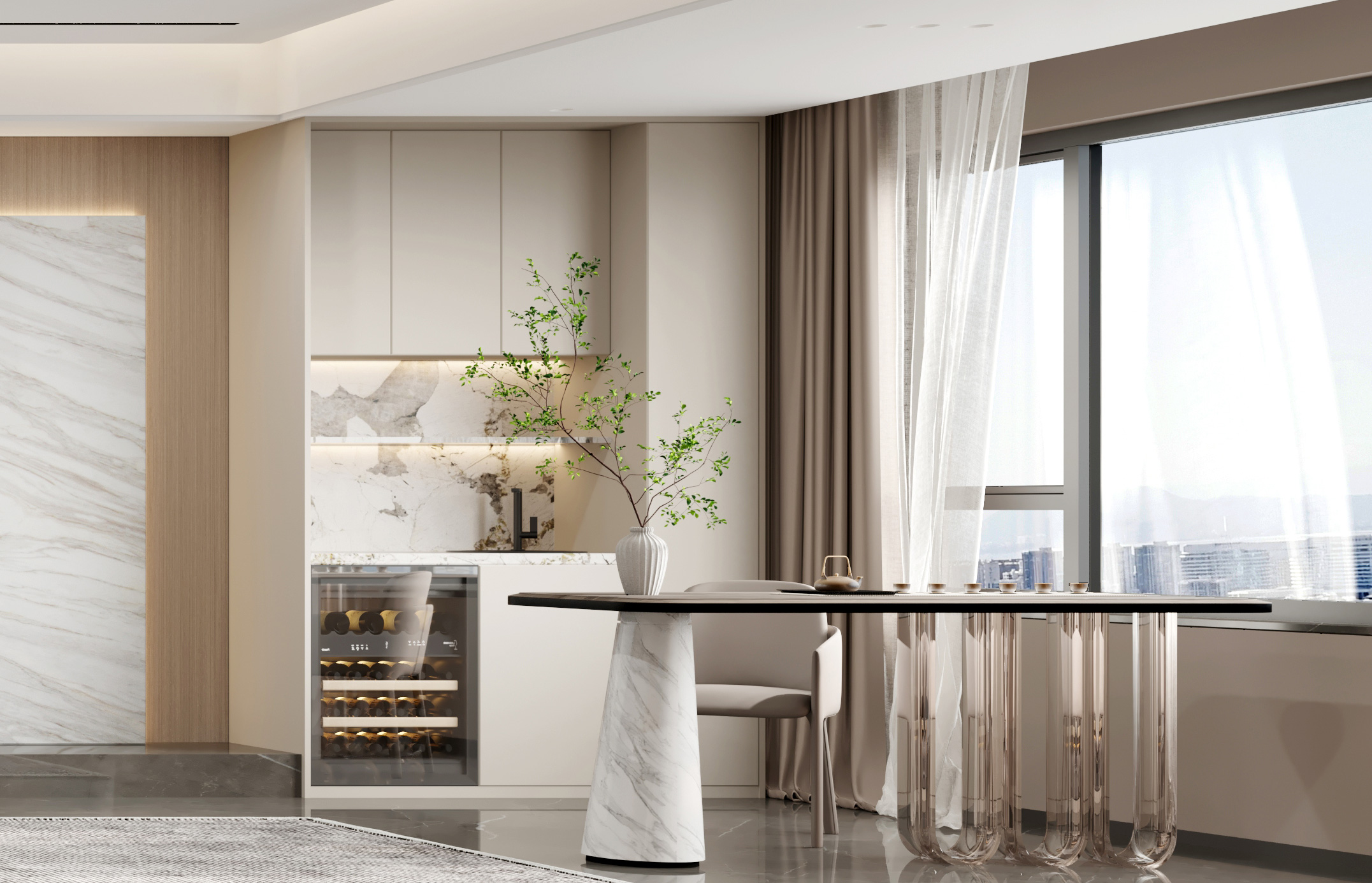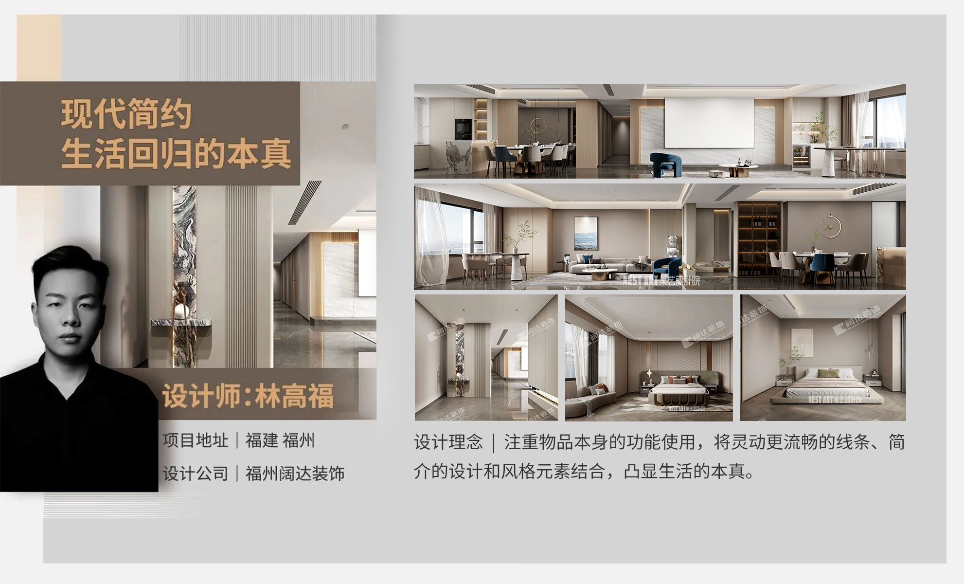著重用空間處理的設計手法,來強調空間的靈活分割,以追求設計的幾何性和秩序感,空間線條簡約、流暢。