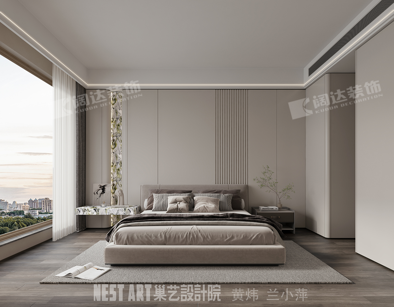 設計師在設計時,將主臥劃分成睡眠區和衣帽間。將主臥的靠窗部位做成睡眠區,把床頭背景墻的位置用造型調平,將邊角位置做成了衣帽間,增加了衣柜及儲物量,調整整個臥室空間的方正性,從而大大利用整體空間。