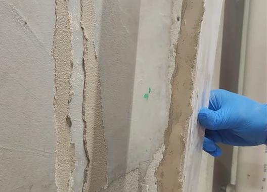 先把攪拌好的材料刮到靠尺上,然后用抹刀將兩邊多余的材料收平,將筋條取掉我們可以看到,石膏未與基層粘結,導致后續筋條空鼓。
